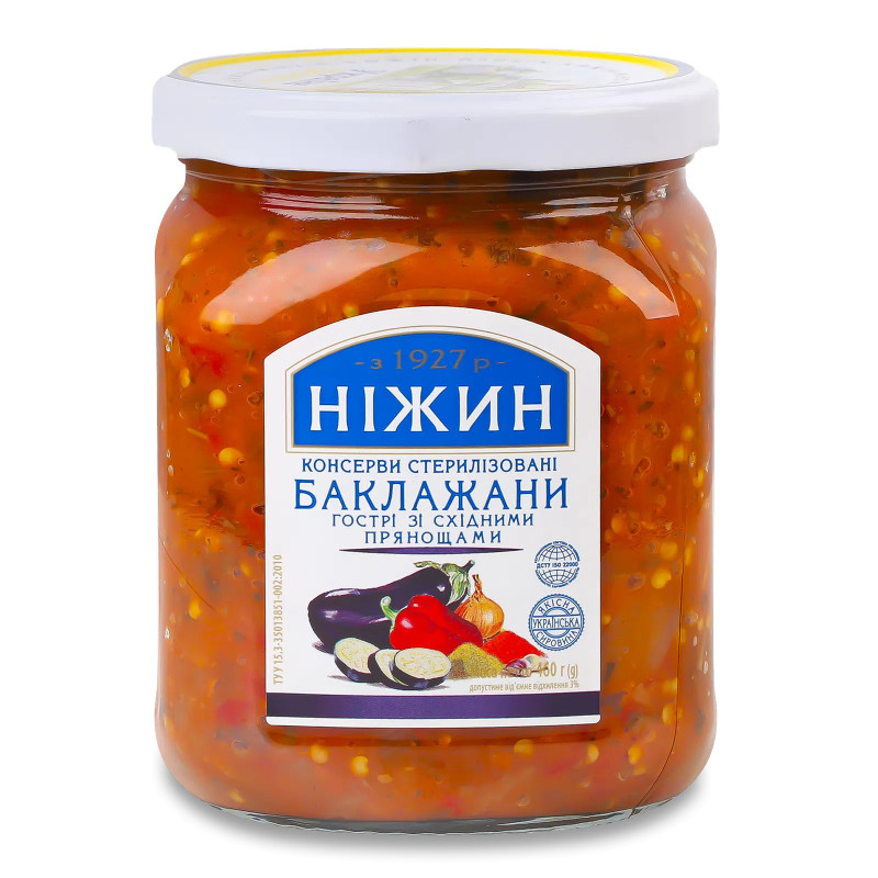Гострі баклажани «Ніжин» – пікантна овочева страва з насиченим смаком і ароматом спецій. Ідеально поєднується з м’ясом, гарнірами чи хлібом.