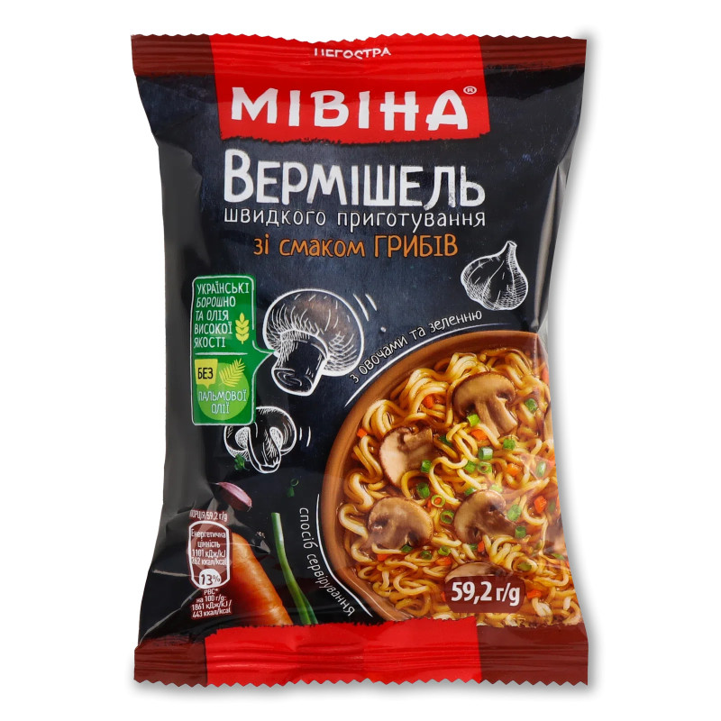 «Мівіна» зі смаком грибів — це ароматна вермішель з насиченим грибним смаком. Створена для тих, хто цінує швидкість приготування та глибину смаку. Ніжний аромат лісових грибів у поєднанні з легким бульйоном створює ситну й апетитну страву.