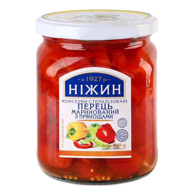 Маринований перець «Ніжин» – соковитий болгарський перець у ніжному маринаді з ароматними спеціями. Має насичений смак і яскравий колір.