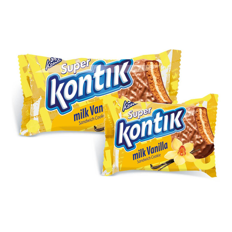 Super Kontik ванільний молочний — це хрустке печиво з ніжною ванільною начинкою. Кожен шматочок наповнений вершковим ароматом і приємною солодкістю, що робить його ідеальним десертом до кави або чаю. Печиво має ідеально збалансований смак і тане в роті.