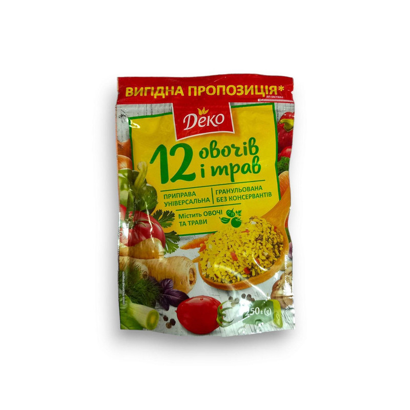 Універсальна приправа „Деко” — це поєднання 12 натуральних овочів і ароматних трав, створене для того, щоб підкреслити смак будь-якої страви. Вона ідеально підходить для супів, м’яса, овочів, каш та соусів. Не містить штучних барвників і підсилювачів смаку.