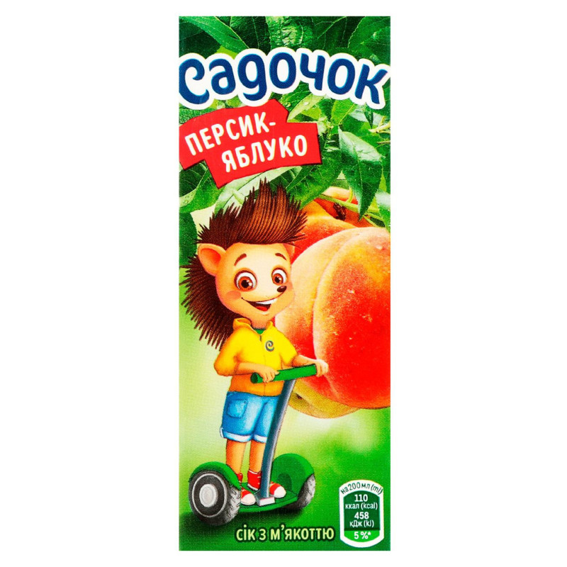 Персик-яблуко з м’якоттю — фруктовий сік у форматі 200 мл.